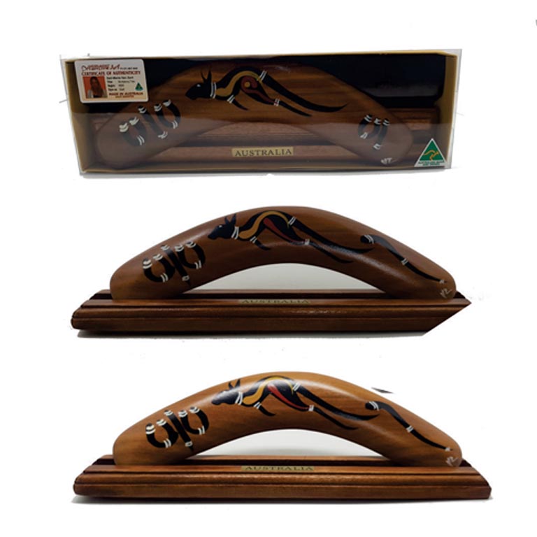 Boxed 10 Inch Animal and Weapons Traditional Boomerang with Stand